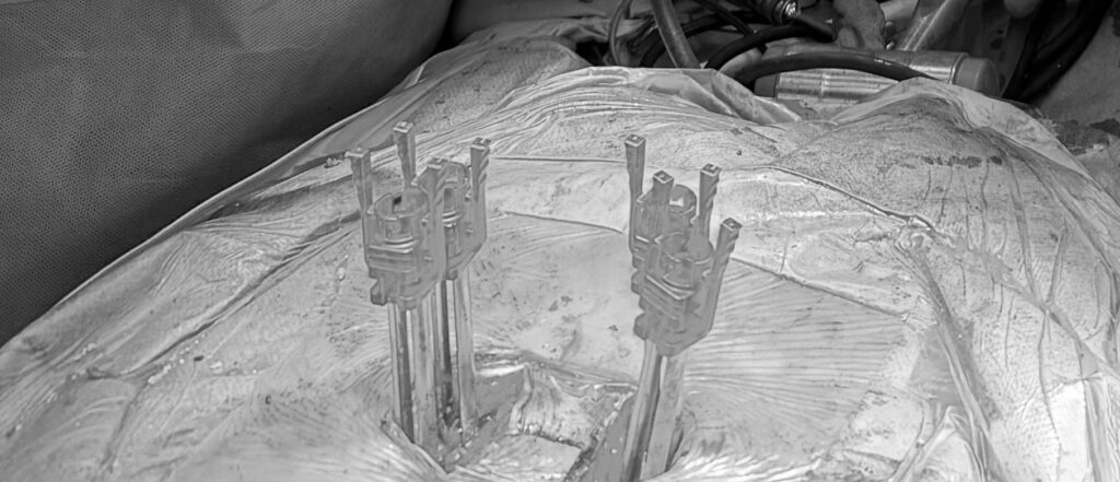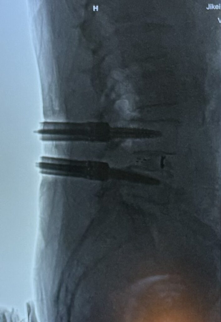 その場でレントゲン確認したところ。これで固定していきます。椎間関節を削る=後方固定が必須ということです。